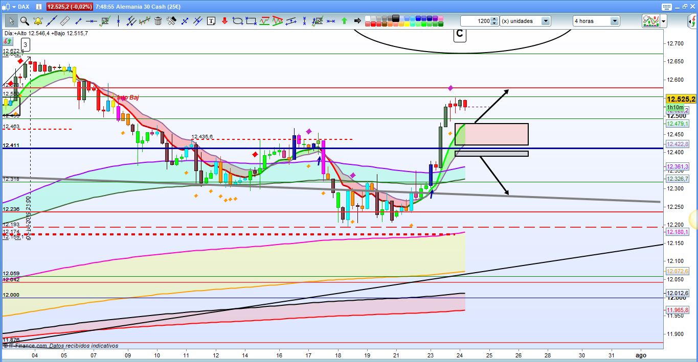 Durante el día de ayer la cotización dax nos regaló un recorrido con más fuerza de la esperada, pasando de la zona de objetivo calculado en 12493, y llegando a la zona del 12540. La zona de corrección, si el impulso ha acabado, como parece, sería la zona del 12478 a 12430, con posible extensión hasta el 12411. Todo dependerá de la fuerza del movimiento en curso, si hace corrección sólo hasta 12478 y sigue camino, o si, en cambio, ha perdido la fuerza alcista de ayer y la corrección es un poco mayor.
