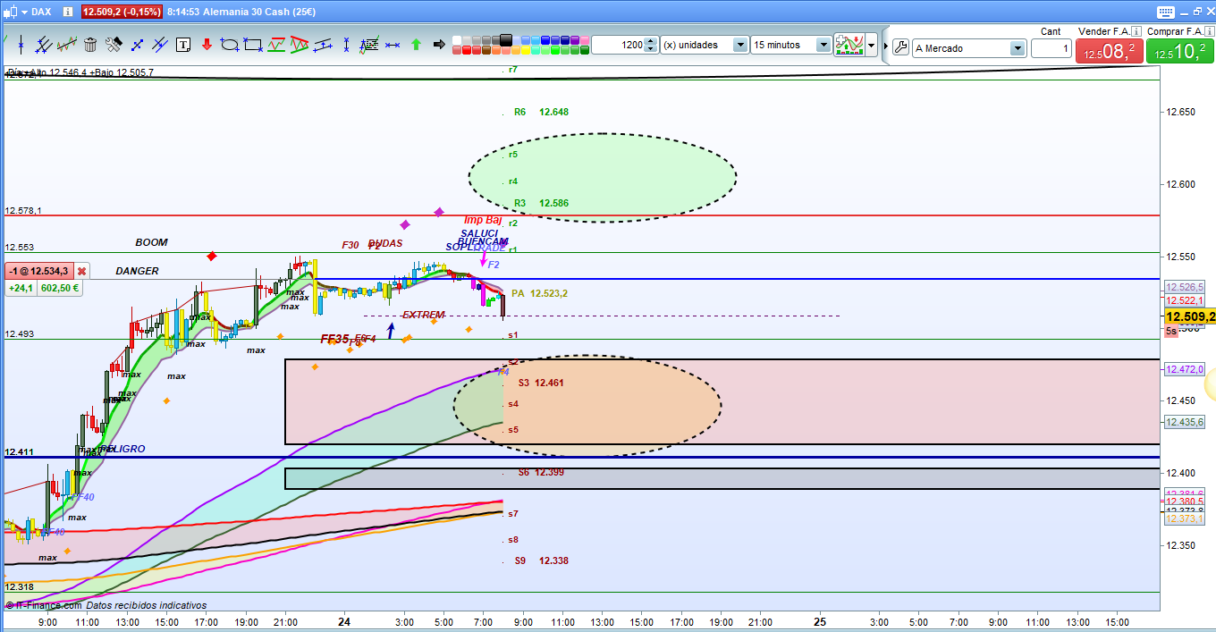 En el gráfico de 15 minutos del dax30, completamente delimitada la zona operable del día. Después del gran recorrido de ayer, creo que en el día de hoy la situación debería ser más calmada, y los movimientos mucho más lentos y difíciles de operar. Si hace una corrección rápida y corta, sí podríamos tener rally hasta 12578, cota histórica. Serían unos 100 puntos. Pero debéis tener en cuenta que puede estar todo el día en la corrección, por lo tanto es muy importante que no intentéis de ningún modo abrir en dirección alcista sin tener muy claras validaciones, porqué es una de aquellas circunstancias donde algunos trades abren órdenes esperando coger el trade perfecto desde la punta, y lo que hacen es minorar de forma importante su cuenta por que el precio, aunque de forma errática, sigue bajando y bajando y saltando una y otra vez los Stop Loss. Vuelvo a lo de siempre, las cabezas y las colas de los movimientos no se operan, a no ser, como ayer por la noche, que el final de movimiento fue ya muy claro y evidente. Pero esto pasa muy de vez en cuanto. Resumiendo: mucha atención a la zona del 12480, que en principio debería alcanzar, al ser la zona mínima de corrección, (siempre hablamos de probabilidades). A partir de este punto sólo quedará estudiar la estructura en curso para intentar marcar el objetivo de final de corrección. Por la parte superior, acabada la corrección, y sobre todo validado el movimiento con un alto por encima de 12552, trade hasta 12578, con posible evolución. Recordad que las correcciones siempre son complejas y llenas de trampas para los traders impacientes, es donde estos pierden el más alto porcentaje de operaciones y de capital. Muchísima suerte y muy buenos trades.