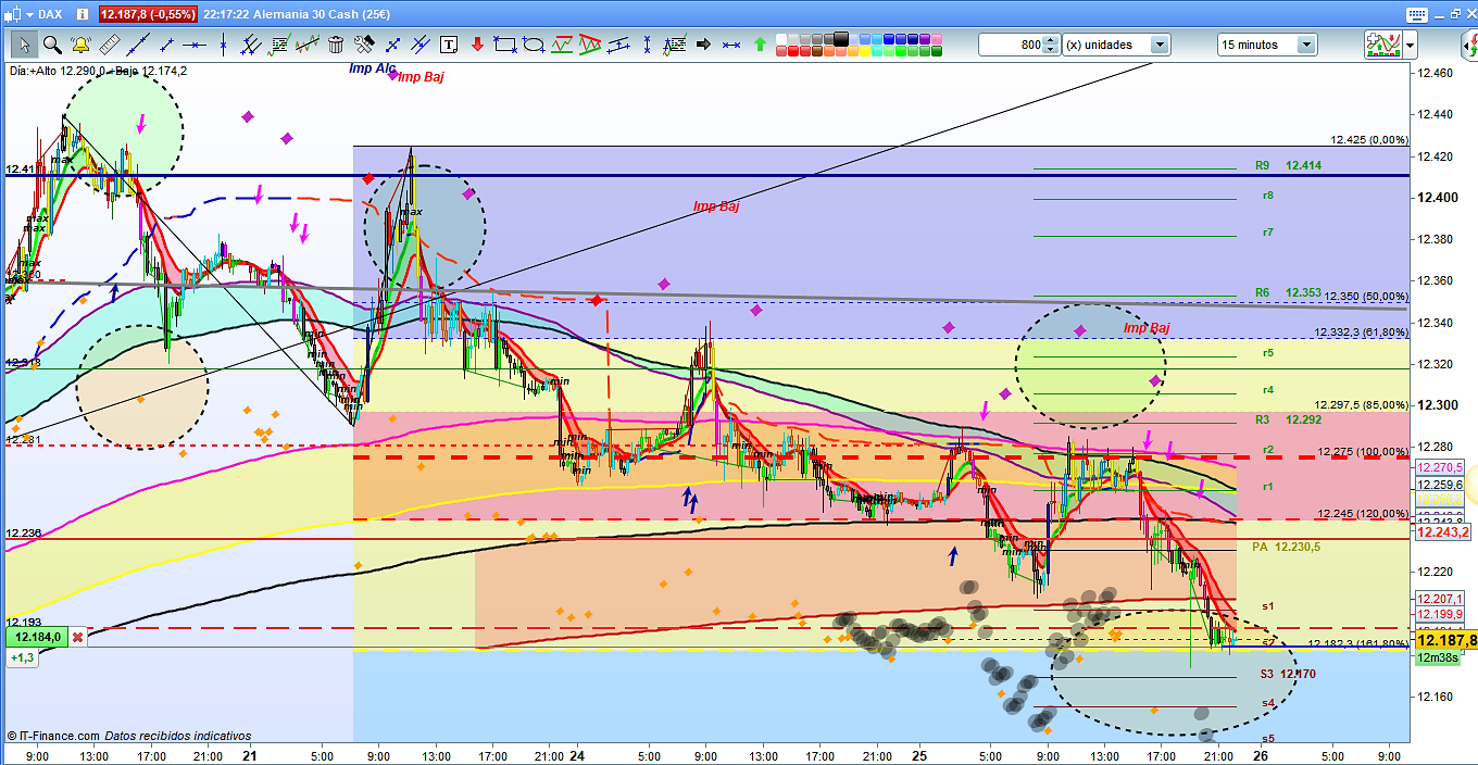 Alcanzado el objetivo en 12180, zona de conflicto y posible zona de rebote. Durante el dia de hoy, habia dos objetivos por la parte de arriba la zona entre 12290 a 12330, (se ha quedado a 5 puntos en 12285), como rebote y posteriormente, ya decíamos que habia muchas probabilidades de ir a buscar los 12180, (cosa que ha hecho casi a las 21 horas). Ahora hay que dejar la evolución de la sesión asiática. para ver donde acaba la cotización dax, y poder proyectar los siguientes movimientos.
