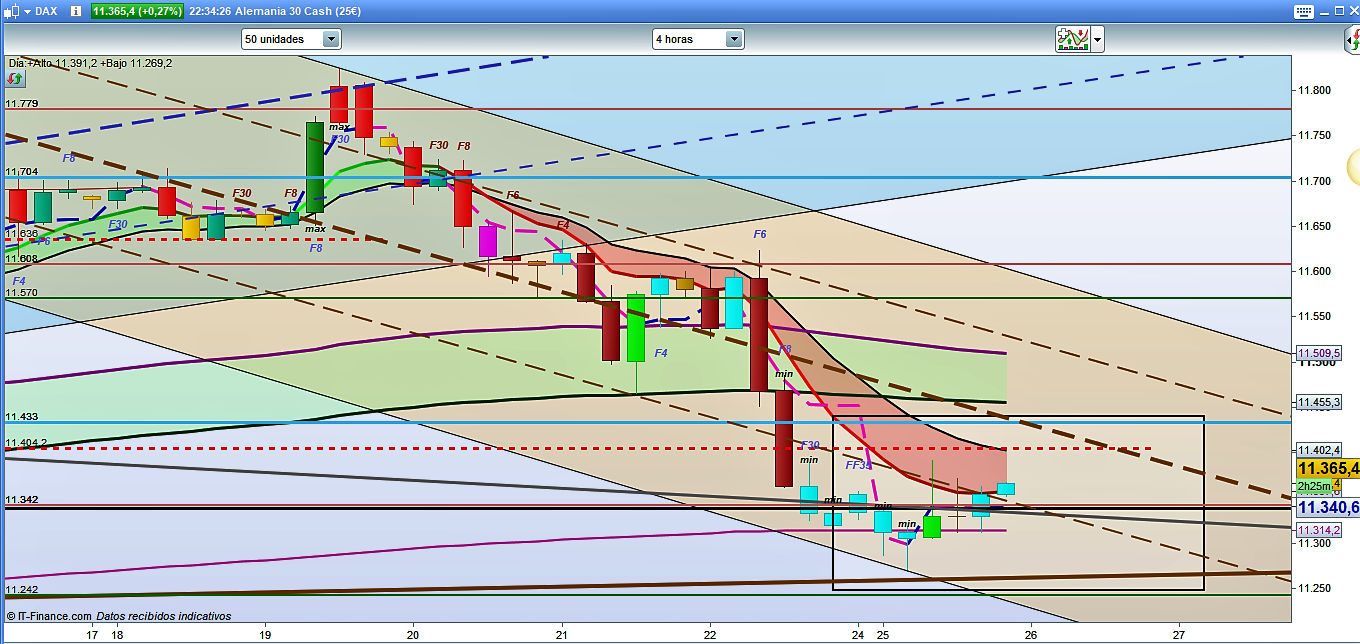 De momento sigue en la zona de indecisión marcada por la directriz trimestral en la zona del 11250, y por la parte superior por la cota histórica del 11433. Dentro de esta zona es muy complicada la operativa ya que el precio podría salir en cualquier dirección, como explicábamos ayer, con las correspondientes proyecciones, tanto en el posible rally superior, como en el posible rally inferior.