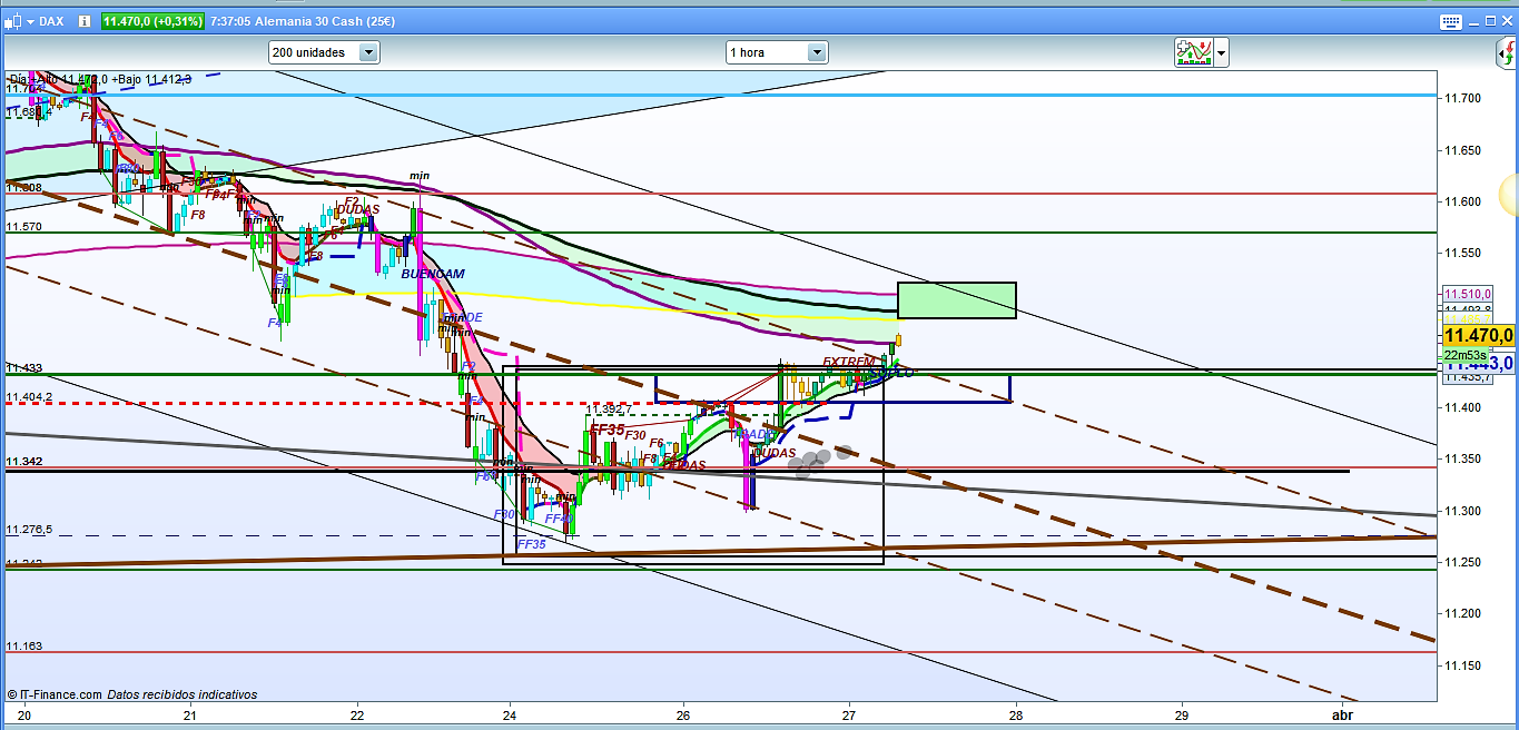 En el gráfico de temporalidad de 15 minutos del Dax30 podemos ver con más detalle la situación de la cotización Dax muy cerca ya de su objetivo. Por lo tanto mucha atención a las dos primeras horas de la sesión, desde pre apertura. Se podría dar el caso que con movimientos rápidos, finalizara el movimiento llegando al objetivo, incluso por la parte más alta del mismo, para posteriormente hacer reversa y tener sesión Europea en sentido bajista o de consolidación lateral bajista, buscando de nuevo la fuerte zona de resistencia, que ahora sería de soporte, del 11400 a 11433. Mucho cuidado a los más noveles porqué si el precio hace un fuerte impulso hacia arriba es cuando muchos entran pensando que se les escapa, y justo en aquel momento hace la reversa y se va en dirección contraria. De ahí la importancia, como siempre comento, de disponer de un buen mapa y conocer, aunque sea mínimamente, la estructura del precio en los mercados. Si os fijáid en la proyección lanzada con mi herramienta, la zona máxima de dicho movimiento estaría situada en 11520 a 11530, con el eje de la directriz del canal antes mencionado en 11520 11524, dependiendo de la hora en que llegue, aunque antes hay viejas zonas conocidas de resistencia, en la zona del 11470 a 11490, que pueden jugar su papel. Especial atención por arriba a la cota 11512, y por la parte de abajo a la cota 11398. Muchísima suerte y muy buenos trades.