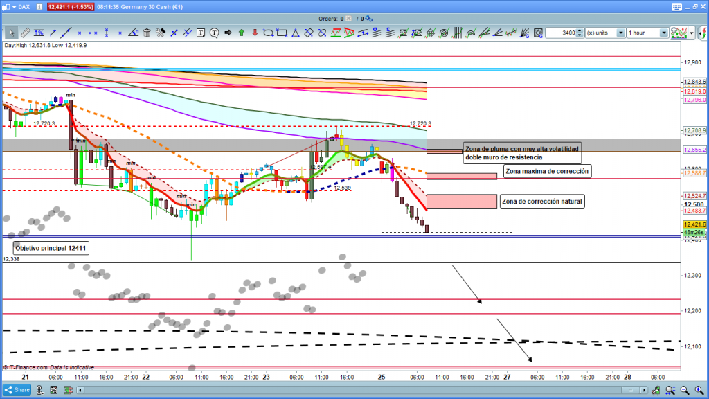 En el gráfico de 1 hora del dax30, tenemos un poco más de detalle de la operativa a más corto plazo, conceptos a tener muy en cuenta estamos en tendencia, no se debería operar contra tendencia sin unos conocimientos y experiencia scalpers importantes. según proyecciones, y fibos alcanzamos ayer 161,8% de movimiento en último impulso de estructura pequeña, con lo que podríamos tener corrección menor hasta una zona entre los 12318 y los 12480, más o menos, todo dependerá de la fuerza del movimiento, como siempre mucha atención a la apertura de Frankfurt. En el gráfico están explicadas las zonas a tener muy en cuenta. Operar en zonas de posible final de recorridos, siempre es muy peligroso, ya que siempre depende de muchos factores que los movimientos terminen en las partes superior o inferior de las zonas proyectadas, si recordáis desde que estábamos en 13000, hablábamos de zona 12100 a 12000, y si hablamos del mes de mayo con las proyecciones de los gráficos de mayor temporalidad la zona a vigilar era los 12000 a 11704. Muchísima suerte y muy buenos trades.