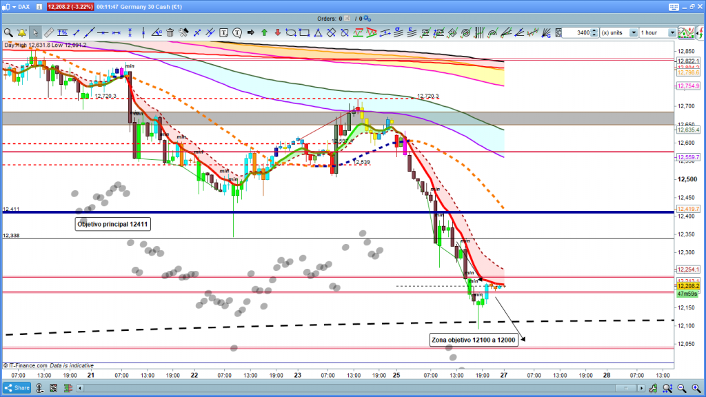 Ya para el día de hoy, vamos a ver los posibles movimientos esperados, si aún le falta un nuevo movimiento para alcanzar un nuevo mínimo, o si por el contrario el testeo a la zona de los 12090, después de bajar 1350 puntos desde 13464, ha sido ya el mínimo del movimiento, y a partir de aquí toca rally alcista, (sin poder saber todavía si es nuevo impulso o corrección).