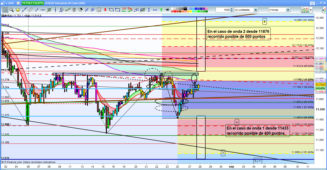 Este es el escenario con los dos posibles estructuras con más probabilidades hasta este momento. Si os fijáis, con un nuevo máximo por encima de 11854, validación de escenario de onda 2, como más probable. En cambio, con un mínimo por debajo de 11412, validación de la estructura de finalización de onda 1. A partir de aquí tenemos el esquema principal de los movimientos más probables. Es cuestión de ir siguiendo el dibujo de cada día e ir tomando medidas de los recorridos que vaya haciendo, de esta forma tendremos un cierto control de la evolución del mercado y, en caso de incumplimiento claro en la evolución de algún recorrido, rápidamente podríamos cambiar la estrategia o salir del mercado.