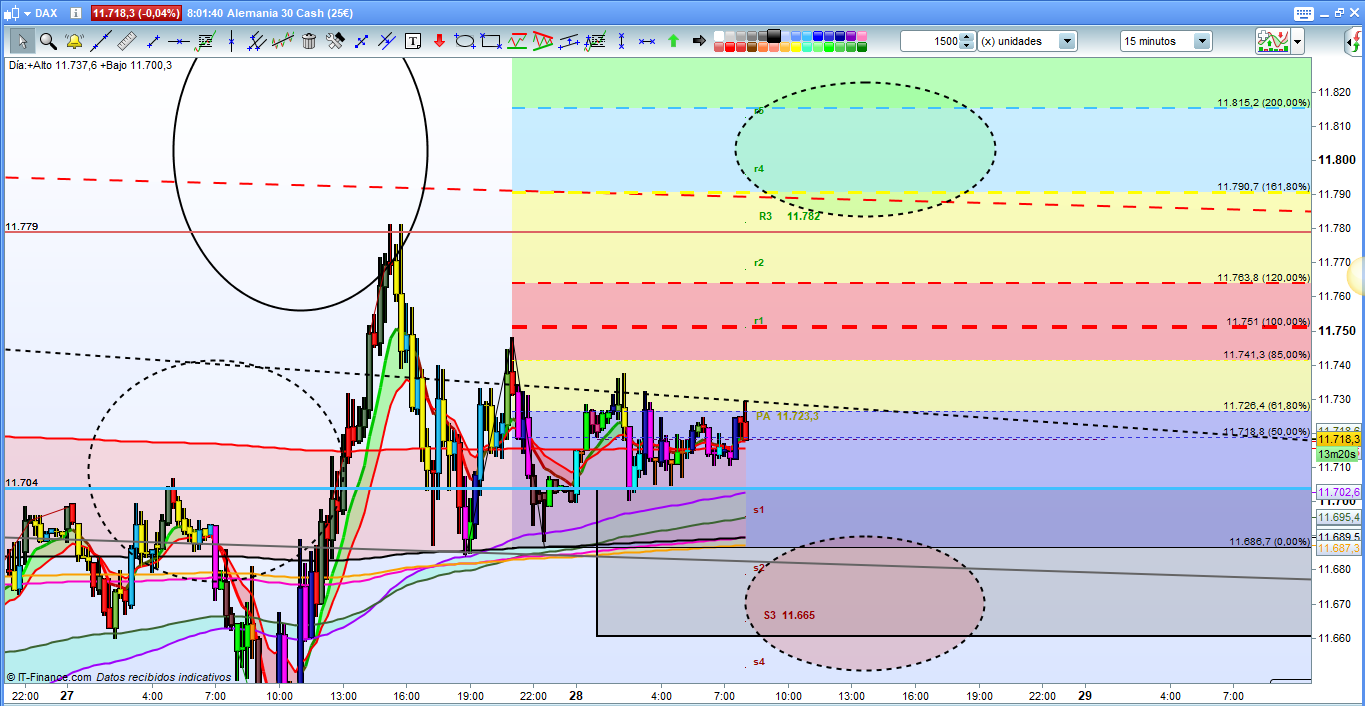 Ayer decíamos «Podemos ver los tres posibles objetivos del actual rally: el corto, 11704 a 11742; el normal, 11779; y el más largo, en 11840» aunque luego, al dibujar posibles recorridos sobre m15, parecía que la zona del 11750, por medidas, podía ser ya el objetivo. Al final, lo de siempre, fibos y medidas y lo normal que el movimiento finalice en la siguiente cota histórica. En el gráfico de 1 hora del dax30, como la cotización dax realizó el recorrido esperado, y rebote en la zona del 11779 para volver de nuevo a la zona del 11704, cota histórica importante. En sesión asiática hoy, sin grandes desplazamientos, se ha quedado consolidando por la parte superior de la mencionada cota en zona 11704. En el gráfico detallado de 1 hora podemos ver como la zona de 11704 a 11660 es una zona de muy fuerte soporte, sólo perdiendo con claridad 11660, evolución clara hasta 11608, cota histórica que justo hoy coincide con la directriz trimestral que viene marcando la evolución de la cotización dax estos últimos 12 meses. Si perdiera estas dos importantes zonas de soporte, muy posiblemente la evolución bajista sería mucho más importante y más clara. Tampoco debemos descartar, un nuevo movimiento alcista, mientras se mantenga por encima de la zona 11704, nada de cortos, ya que podría hacer un nuevo rally hacia arriba,