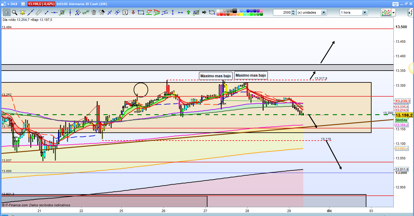 En el grafico de 1 hora del dax30, ya es el tercer o cuarto dia con el mismo planteamiento de análisis, pero es que si no se mueve de las zonas en las que la cotización dax esta acotada, no hay otro análisis posible. Hoy antes de pre apertura estamos situados en la zona del 13200, de entrada parece que podríamos tener un nuevo rebote, el enésimo en la misma zona para ir a buscar de nuevo la zona de 13245 a 13262, de entrada y a partir de aqui ver si entra volatilidad, y trazar futuras proyecciones, viendo básicamente como actúa si es que llega hasta la zona del 13262, si hubiera quiebre y confirmación, posible rally por arriba hasta la zona de resistencia del 13300 a 13317, si hay rebote o incluso no llegara, un posible nuevo ataque a la zona del 13200, esta vez si podría ser de ruptura y seguir bajando. Si de entrada ya pierde los 13200, mucha atencion a la zona del 13185, si la pierde directos al 13153 cota histórica. Solo perdiendo 13110, ataque, que si que ya seria muy importante a la zona del 13040, y un nuevo minimo nos abriría la posibilidad explicada al principio de este análisis con el grafico de 4 horas, con recorridos a la baja mucho más importantes.
