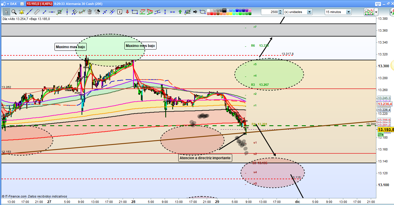 En grafico de 15 minutos del dax30. solo la zona operable del dia con las zonas objetivo y las zonas de soporte resistencia y validación, Solo resaltar en las primeras horas, la zona entre los 13200, y la directriz importante en la zona del 13185 13190, Todo y haber efectuado un nuevo minimo, esta zona podría ser de rebote antes de seguir camino, o quizas visto lo visto estas ultimas 4 semanas de rebote más significativo. Precaución, paciencia y disciplina, donde no este claro ganar, siempre se ha de mirar de no perder. Deseo que paséis un muy buen fin de semana, Muchísima suerte y muy buenos trades.