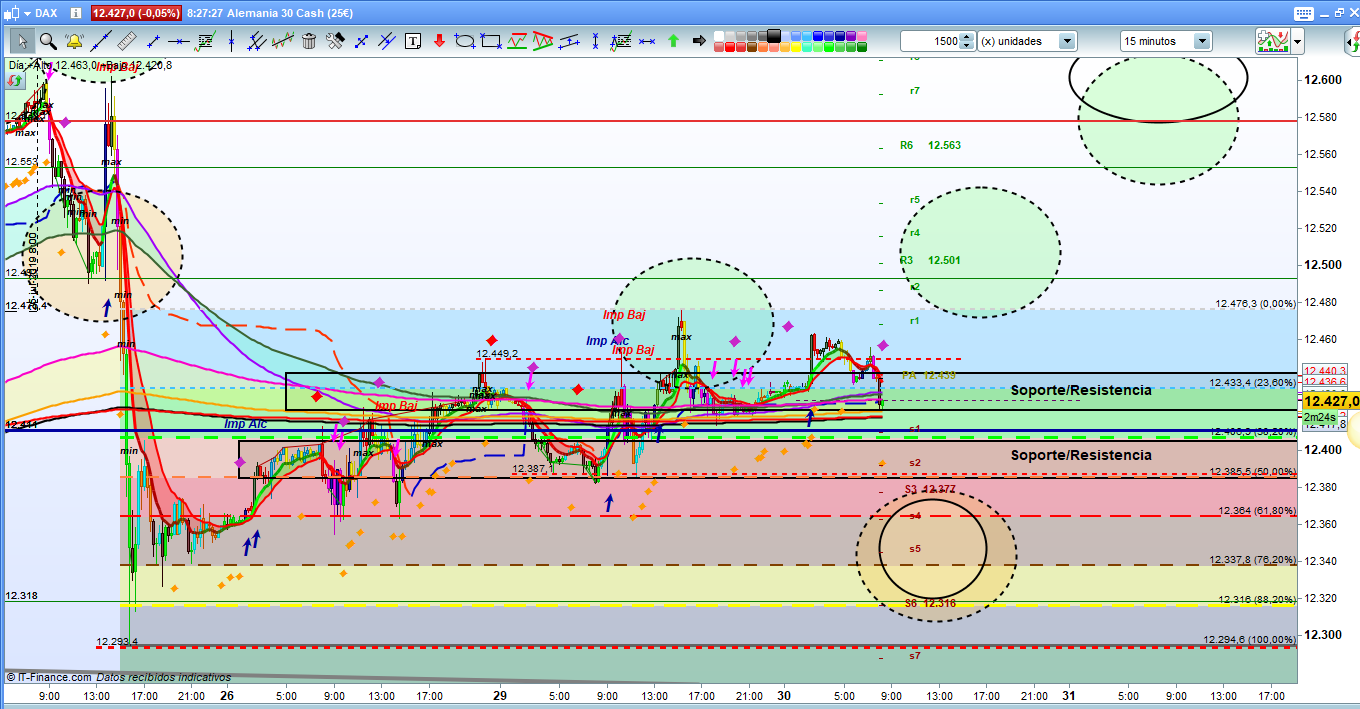 En el grafico de 15 minutos de dax 30, como cada dia, marcar las zonas más posibles como objetivos del dia, para disponer de una guía y no esperar recorridos más importantes dentro de la misma sesión. Si os fijáis el movimiento impulsivo/correctivo desde el minimo de 12293 hasta 12475, ha necesitado más de dos dias para formarse, y sin embargo el dibujo bajista, despues de la sesión asiática de el dia de hoy, está bastante claro. Falta ver si solo es corrección, o continuidad del impulso bajista mayor, este es el motivo de marcar la zona del 12365 hasta 12318, como de especial atencion, ya que en ella, en caso de que solo sea corrección, es donde debería darse la vuelta. Sin embargo, la cantinela de cada dia, necesitamos un poco más de volatilidad, ya que si no es asi, continuaremos en movimientos erráticos constantes para quebrar la zona del 12411, y la posterior zona de soporte inferior. Esperemos que la volatilidad de las 9 h nos ayude a aclarar un poco más el camino. Para los demás escenarios posibles, lo ya explicado en los párrafos anteriores. Muchísima suerte y muy buenos trades