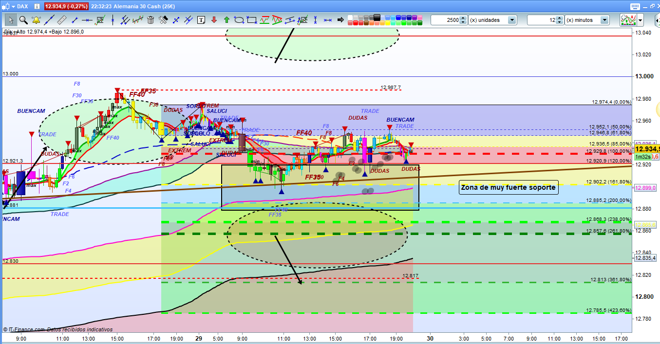 Durante el día de ayer se cumplió una vez más el escenario más probable esperado, y explicado detalladamente en el análisis del día. Personalmente, y gracias a las horas en que empiezo el análisis, pude realizar un trade desde 12950 a 12900, y cuando pensaba que podría ser un buen día porque a las 10,30 h ya se había cerrado mi trade y había sonado la alarma avisándome, pensaba que tendría la posibilidad de hacer un segundo trade, si os fijáis, no se ha producido ningún nuevo alto por encima del máximo de las 9h en 12960 ni ningún mínimo significativo por debajo de 12881, para una posible entrada a cortos. Resumiendo día de consolidación lateral, atacando una y otra vez la zona de fuerte soporte marcada a las 6 de la mañana, sin poder quebrarla y sin rebote significativo para poder operarlo en Intradía, solo para scalpers muy expertos que hayan detectado el suelo o hayan seguido las indicaciones de la zona de fuerte soporte. Por tanto, otro día de tantos de un solo trade para mí.