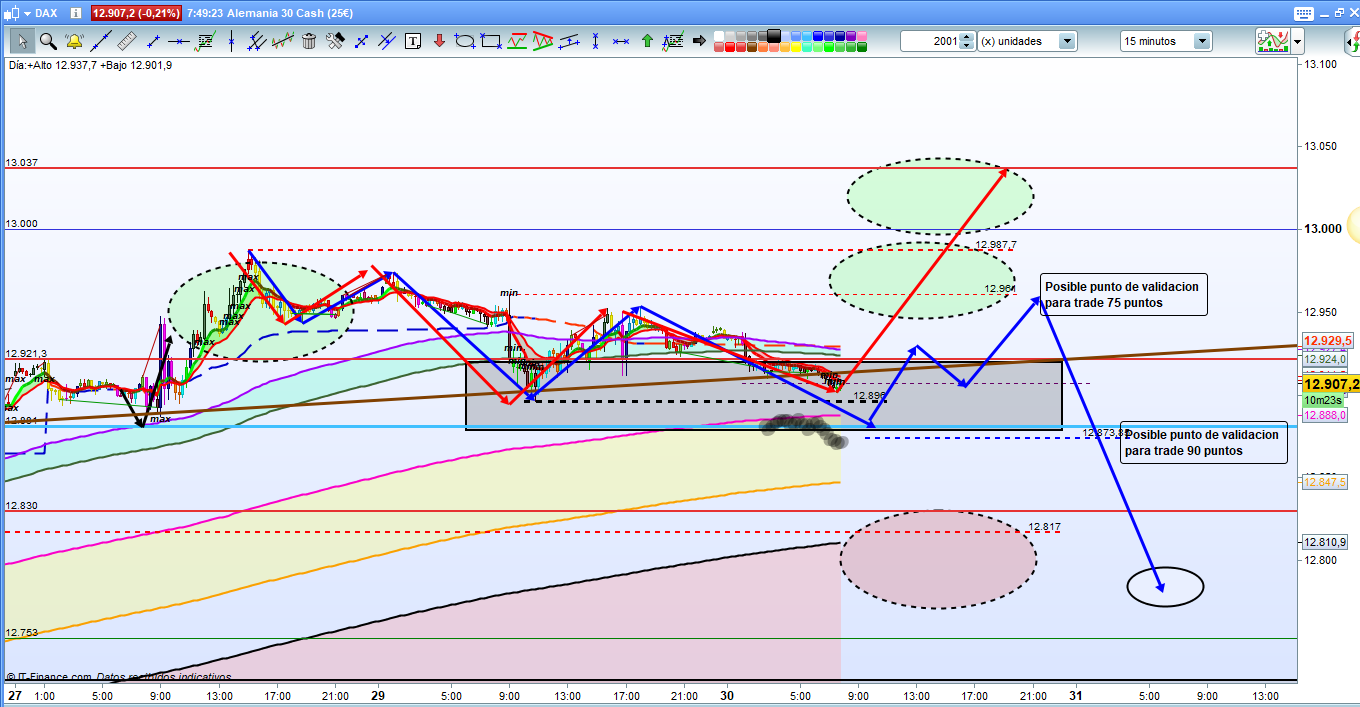 En el gráfico de 15 minutos del dax30, podemos ver dibujados los dos escenarios más probables, recordad que siempre hablamos de probabilidades, y como y porque la clave es la zona marcada como mínimo en el día de ayer. La clave del día en 12896, si hace un nuevo mínimo y completa figura impulsiva de 5 ondas, como mínimo, deberíamos tener, una corrección y un posterior movimiento bajista, probable con una proyección del 161,8% del movimiento anterior que nos debería llevar hasta la zona de los 12787, siempre teniendo en cuenta la volatilidad, una cosa es la proyección del objetivo y luego otra muy diferente que dependiendo de múltiples factores, volatilidad, hora del día en que se produce el movimiento, etc. dichas zonas de proyección pueden quedar o más cortas o sobrepasarlas en algunos puntos. Si el movimiento bajista fuera con fuerza, muy probable el rally hasta 12753, y si fuera muy trabado y sin volatilidad, se podría quedar en la zona del 12817 a 12800. Por la parte superior, en el caso de que no tengamos nuevo mínimo por debajo de 12896, y tuviéramos recorrido alcista el punto de validación a largos seria en 12961, con confirmación y aumento significativo de las probabilidades, con un alto superior a 12987. Y estamos en lo mismo la proyección del objetivo, sería la zona del 13000, zona de resistencia a nivel psicológico de primer grado, con más que posible expansión hasta la cota histórica del 13037, en el caso que superara esta cota, con un patrón de quiebre, confirmación, validación, por la pare de arriba no hay resistencias significativas hasta la zona de 13160 a 13200, por tanto lo mismo que decíamos para el recorrido bajista, dependiendo de la volatilidad y a la hora del día en que se produzcan estas teóricas validaciones, podríamos tener recorridos más largos o más cortos con las proyecciones objetivo. Muchísima suerte y muy buenos trades.