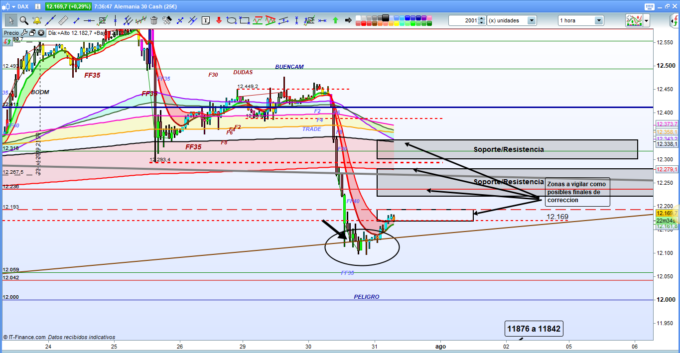 En el grafico de 1 hora del dax 30, lo comentado más detalle de la zona operable esperada del dia, recordar que tendremos 3 momentos de posible fuerte ruido, habrá que ver que dibuja en la estructura, la apertura de las 9 h. y la publicación de las diferentes fundamentales a las 11h, 20 h, y 20:30 h, para poder trazar los objetivos de corto plazo con mayor exactitud. Zonas a vigilar las marcadas en el grafico, 12169 a 12193, si la supera 12236, directriz de corto plazo (tan importante en estas ultimas semanas, ayer tambien la reconoció y confirmo él quiebre) hoy pasa por la zona del 12268, 12318, y en caso de alta volatilidad durante las horas de la sesión europea, las zonas naturales de corrección, han quedado en la zona del 12337 a 12360, debido a la fuerza del movimiento de ayer. En condiciones normales, (sin publicación de fundamentales importantes) lo más normal seria que la cotización dax, despues de la bajada con alta volatilidad, se tomara un descanso en forma lateral hasta el siguiente impulso, como en el periodo del 25 al 29 de julio, sin embargo creo que hoy puede seguir la volatilidad en las diferentes horas explicadas.