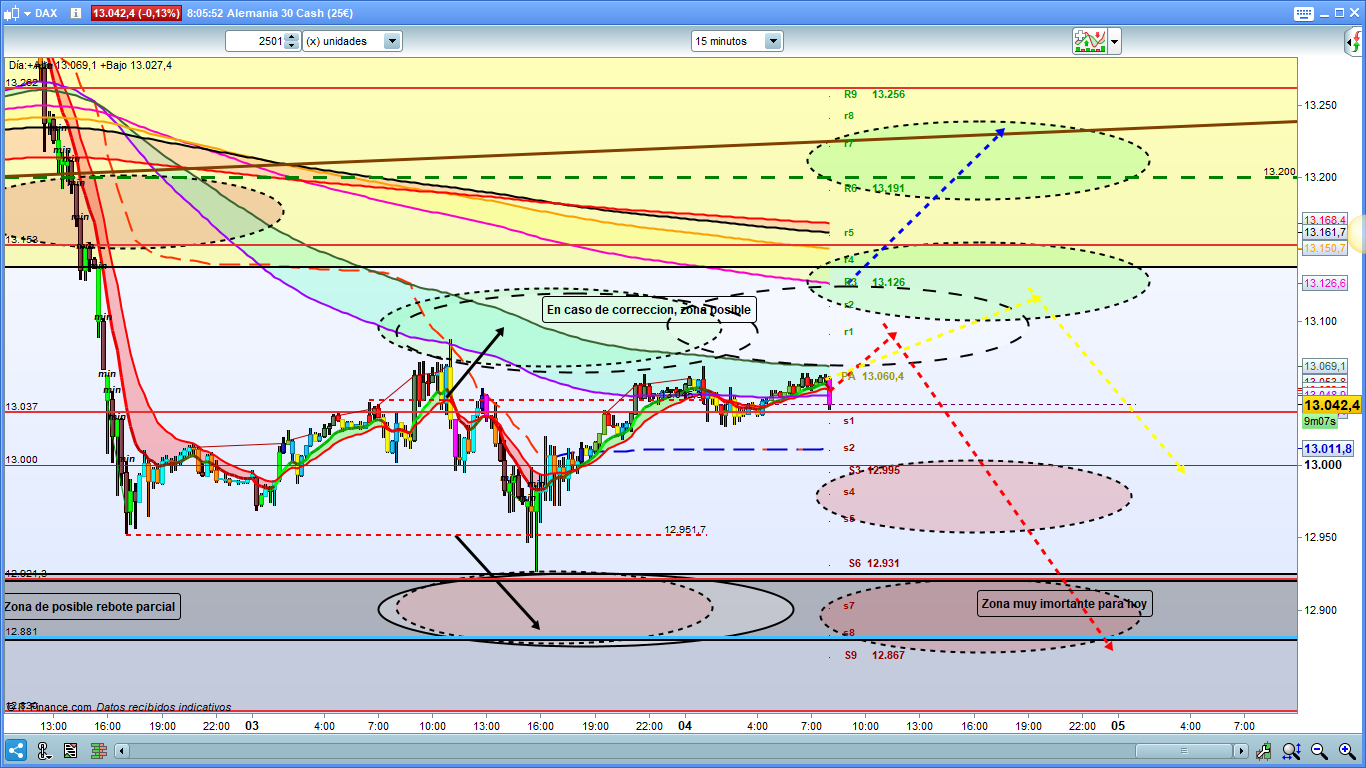 En el gráfico de 15 minutos del dax30, pocas cosas más a añadir, En el día de ayer, la cotización dax testeo las dos zonas objetivo del día, pero si os fijáis, los dos testeos fueron muy justos justo en las zonas de las primeras mediciones, sin fuerza, sin nada de la volatilidad del día anterior. Pues para hoy de nuevo todo dependerá de la volatilidad, en principio esta debería crecer a l pasar uno de los dos puntos de validación del día. Por arriba 13140 a 13155, y por abajo con nuevo mínimo en 12925, sin embargo, veremos cómo empieza el día en pre apertura y como siempre después de la primera hora de apertura. Como podéis ver en el gráfico hoy hay dobles zonas de objetivo por si entra volatilidad. Dentro del espacio operable, las zonas a vigilar con especial atención son: 13085 a 13100, y 13140 13155 por arriba para objetivos 13200 13220 y 13262. Por abajo la zona de 13000 a 12970 12960, (posibles zonas de giro) 12925, impulso bajista y 12881, si llegando al lo quebrara y confirmara, las zonas objetivo primarias recordad que son 12800 12753, de corrección menor. Muchísima suerte y muy buenos trades.