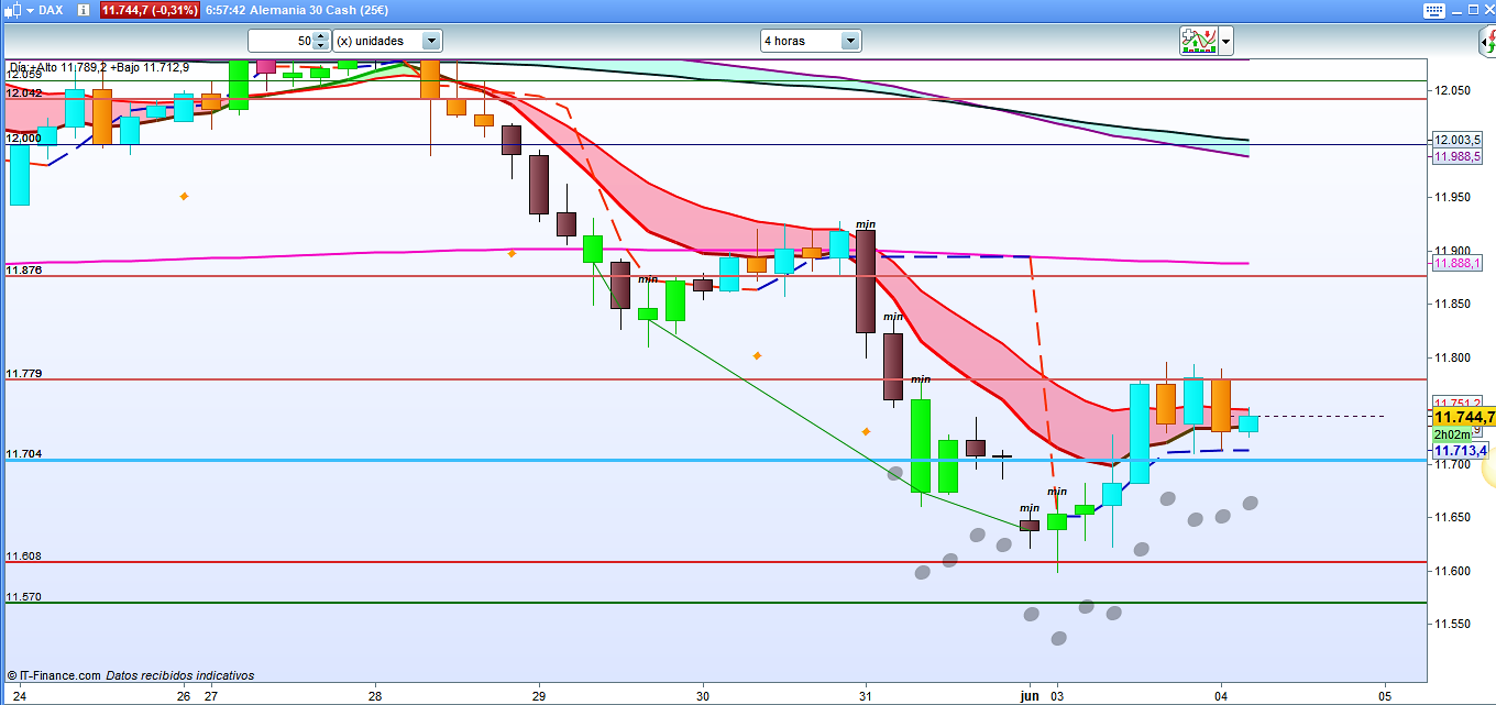En el gráfico de 4 horas del dax30 podemos ver de una forma clara lo comentado anteriormente. La cotización dax ha estado peleando la resistencia que ofrece la cota histórica 11779. Las últimas 4 velas, a parte de la vela en curso, que ha comenzado a las 5 de la mañana, han estado testeando la posible rotura de la zona sin conseguirlo. O en el próximo ataque, aprovechando la volatilidad de la pre apertura o apertura, lo consigue, para finalizar la corrección hasta la zona comentada 11813 a 11876 o, en caso de que no pueda con ella y pierda la zona del 11704, prosigue camino de nuevo hacia 11608 a 11570. Y si los pierde, ya sin grandes obstáculos hasta 1143, la siguiente cota histórica importante de origen semanal que queda antes de los 11010.