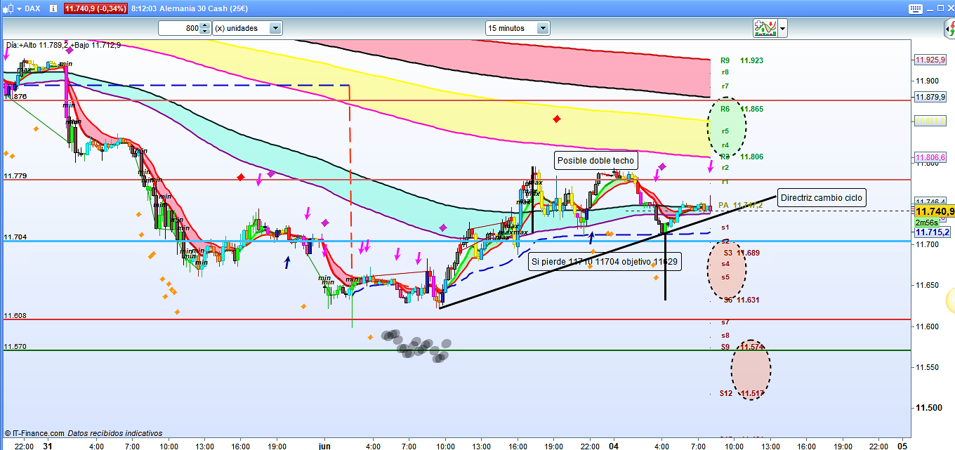 Para el día de hoy tenemos la situación inversa, vemos como la cotización dax se apoya una y otra vez sobre la diagonal 1/1, sin romperla en la zona del 11720 en su primer ataque (que casualidad), y ahora en la zona del 11740. En el caso de que perdiera esta directriz deberíamos dar el impulso por finalizado, al menos temporalmente, y con trade de altas probabilidades hasta la zona del 11690, justo por debajo de la cota del 11704. Este estudio es a muy corto plazo, sólo para tener pistas sobre la evolución del dax30 más inmediata. Testeada la zona del 11690, podría seguir cayendo o empezando un nuevo rally alcista, hasta la zona del 11813 a 11876, tenedlo en cuenta. Nada es nunca definitivo en los mercados, sin embargo saber identificar estas pautas es lo que da buenos recorridos a los traders de Intradía.