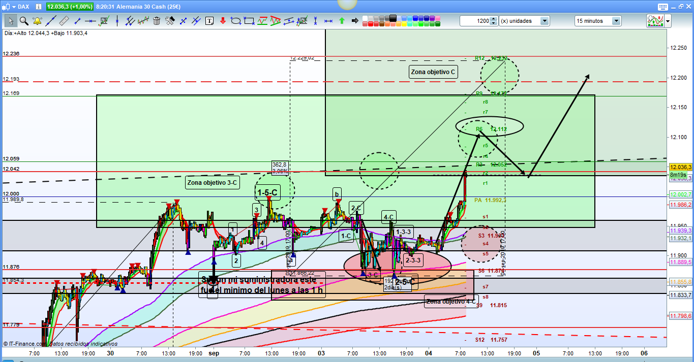 En el grafico de 15 minutos del dax30, la zona esperada operable del dia primera resistencia en la zona 12042 a 12059, superada esta zona la zona objetivo de la onda 3 de 5 de C de esta onda 2, seria la zona 12090 a 12125, si no lateraliza excesivamente, posible corrección hasta esta cota de 12042 actuando de soporte y de aqui el impulso final a la zona de las dos gemelas, en 12193 a 12236. En la resistencia actual, en 12042, es posible que consolide antes de seguir camino, y mucha atencion a la apertura de mercado de las 9 h. y su volatilidad. Muchísima suerte y muy buenos trades.