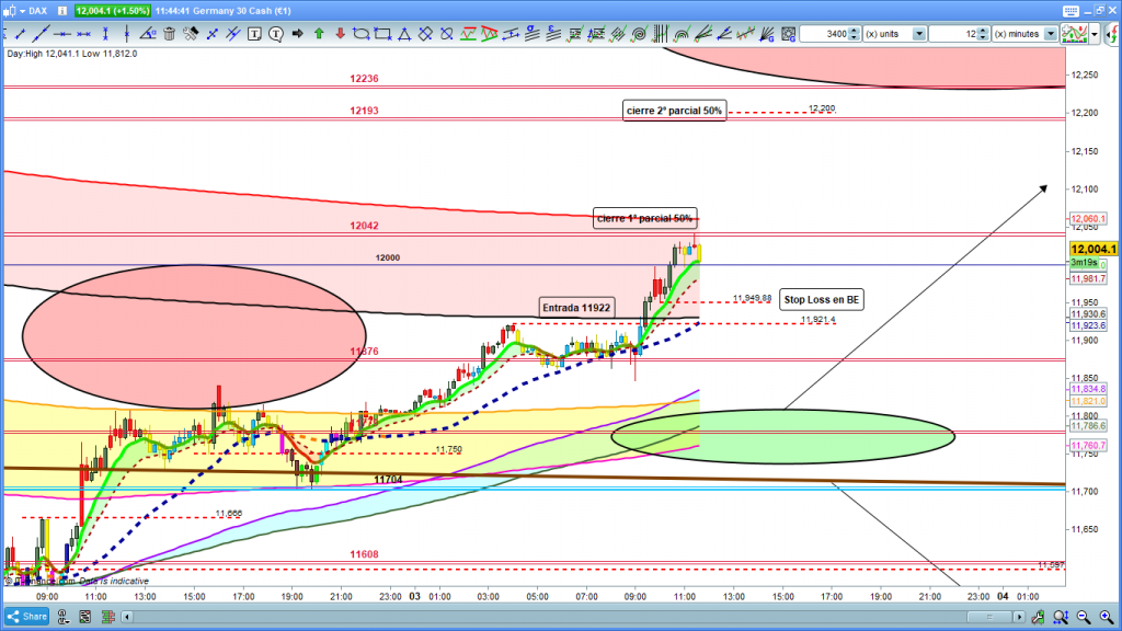Posteriormente a las 11,30, tanto en twitter como en el foro dax investing colgaba post con gráfico explicando el cierre del primer parcial, y la colocación del Stop Loss en BE+++ sobre la zona del 11949. dejando un segundo parcial con Take profit en los 12200. unos puntos por encima de la cota histórica inferior de las dos gemelas.