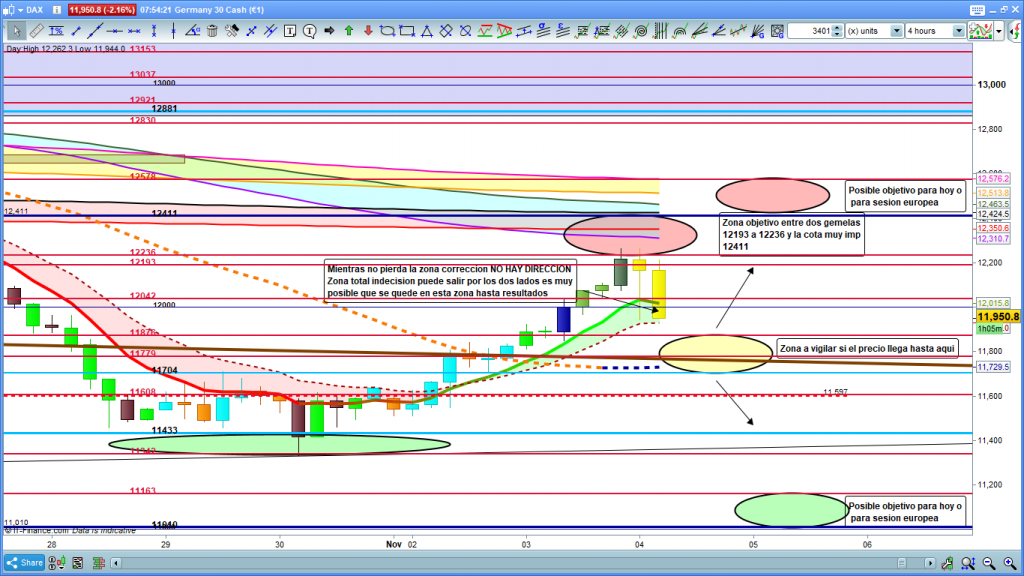 Lo mejor sin duda en estas primeras horas es estar fuera del mercado hasta la finalización del escrutinio ya habéis visto los latigazos de las 3,30 h aquí no gana nadie al revés se puede perder y mucho porque hasta los Stops Loss cierran con Slipage o desplazamientos importantes lejos de la zona donde estaban situados, sin embargo para tener una idea de lo que pueda pasar en el día de hoy, en el gráfico de 4 horas del dax30, podemos ver las zonas más importantes a tener en cuenta. primero la situación ahora casi ya en pre apertura dentro de la zona de corrección de H4, mientras no pierda con claridad esta zona por arriba o por abajo o sea entre los 11930 y los 12042, No hay operativa posible, en caso de perderla por abajo, el primer objetivo a vigilar sería la zona entre 11876, y 11704, solo con una perdida clara con cierres de velas importantes de 11704, objetivo primario la zona 11163 a 11010. Si tenemos rebote una vez conocidos los resultados de nuevo alcista, va a depender mucho de la cota alcanzada antes en la corrección por la parte de abajo, el objetivo primario seria: la zona comprendida entre los 12411 y los 12578, mucha atención a posibles plumas muy espectaculares, La verdad hoy es un día muy complejo de operar lo mejor seria estar fuera del mercado hasta que todo se calme ya mañana.
