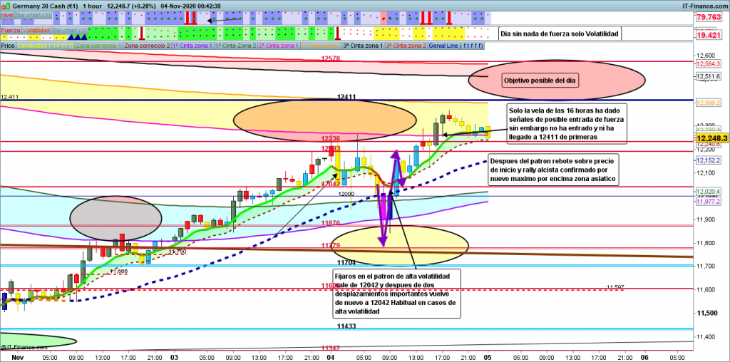 Varios detalles, Patrón de indecisión con alta volatilidad, es algo que suele ocurrir 3 o 4 ocasiones cada año, en momentos de muy alta volatilidad como una gran diferencia del consenso de un dato macro de los muy importantes, o alguna fundamental de estas como la situación generada con las elecciones Usa, donde todos están nerviosos pero realmente no saben como actuar. Fijaros bien a las 8 h en punto testeo con pullback de confirmación de quiebre de 12042 bajista, movimiento rápido e importante hasta cota histórica de 11779 rebote, rápido movimiento de vuelta hasta 12042 y sin parar directo a testear 12193 cota histórica inferior de las dos gemelas para posteriormente volver donde todo empezó en 12042, 3 horas y media después. A partir de ahí ha empezado el movimiento del día, aunque sin fuerza solo con entradas temporales de volatilidad. Solo a las 16 h después de haber superado las dos gemelas, parecía (con el indicador de velas) que podía entrar un poco de fuerza, personalmente pensaba que suficiente para llegar hasta 12411 de primeras, pero no ha sido así, a las 19 h ha finalizado esta tenue entrada de fuerza sin haber alcanzado el objetivo, se ha quedado en 12366, y de nuevo deambular correctivo lateral, justo a las 00 h por encima de la zona de corrección de H1.