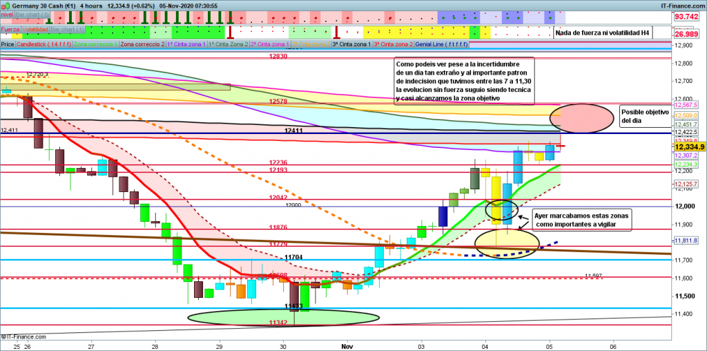 En el gráfico de 4 horas del dax30, podemos ver como pese a todo lo acaecido durante el día de ayer y después de un amplio patrón de indecisión con más de 200 puntos de caída, vuelta a origen en 12042, 150 puntos de subida y de nuevo vuelta a origen, la cotización dax continuo su camino tendencial aunque sin ningún tipo de fuerza, con lo que los movimientos eran complicados de operar para Intradia. Movimiento versus el objetivo del día que ayer se quedó a unos 50 puntos y hoy durante asiática se ha acercado hasta los 20 puntos del objetivo la cota histórica muy importante de los 12411. Para el día de hoy, me temo que la cotización dax se puede quedar en esta zona 12411, más su zona de influencia unos 100 puntos por arriba y por abajo, esperando noticias que den alguna pista de lo que va a acontecer en Usa. Parece evidente la victoria de Biden, pero ya desde ayer Trump estaba pidiendo donativos a sus votantes para pedir recuentos en media Usa, este hecho es precisamente el que puede causar problemas en los mercados, si como parece vienen semanas de mucho conflicto judicial y social. Técnicamente, esta zona actual puede ser una zona refugio a la espera de acontecimientos.