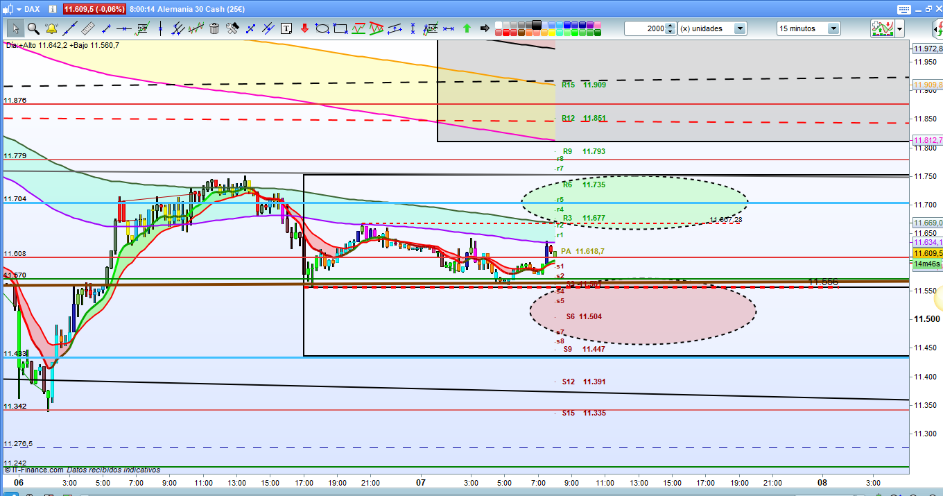 En el gráfico de 15 minutos del dax30, como cada día, más detalle de la zona operable, así como de las diferentes zonas a tener en cuenta. Máximo por encima del 11668, trade de altas probabilidades hasta 11704. La pérdida del 11556, trade de altas probabilidades hasta 11433. Por encima de 11752, largos, con recorridos; por debajo de 11339, cortos con recorridos. Espero que estas zonas y puntos de validación os ayuden en vuestra operativa. Sin embargo, prudencia y muy atentos a la volatilidad, ya que después de tantos días, podríamos entrar en fase relax, sin apenas movimientos. Muchísima suerte y muy buenos trades.