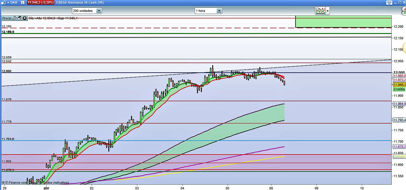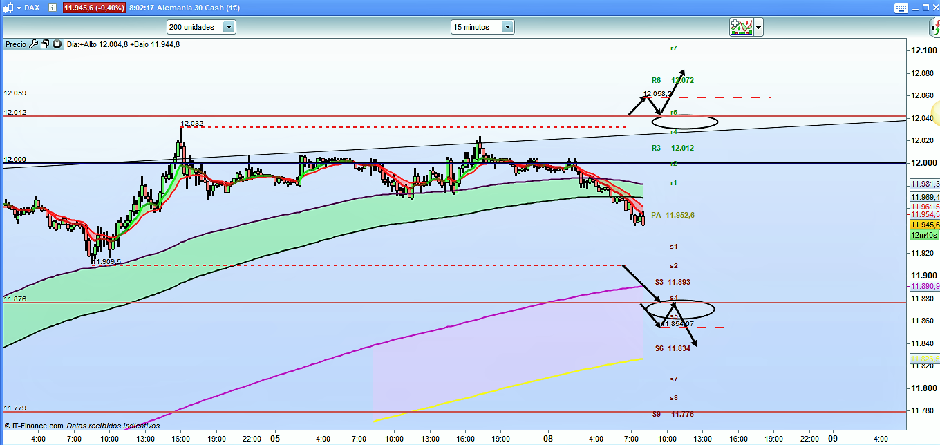 El análisis técnico de hoy es prácticamente calcado al del viernes. Los que hayáis visto el vídeo del análisis semanal de este fin de semana ya tendréis muy claro que estamos en una zona de conflicto importante y que, hasta que salga con claridad de ella, tanto por arriba como por abajo, no tendremos ninguna posibilidad clara de operar el Intradía. Seguirá siendo sólo territorio de scalpers. Por la parte de arriba tendríamos recorridos si el precio quebrara con claridad la cota histórica 12042, con posterior confirmación y validación del movimiento. Y por la parte de abajo un nuevo mínimo, aunque sea en vela en movimiento más bajo de 11909, nos permitiría un trade hasta la muy próxima cota histórica del 11876. Si ocurriera esto creo que si no hay una muy fuerte volatilidad, lo más probable sería que en esta zona rebotara de nuevo al menos en primera instancia. Tan solo un quiebre, confirmación y validación por debajo de esta cota histórica del 11978, nos daría recorridos hasta la siguiente cota en 11779.