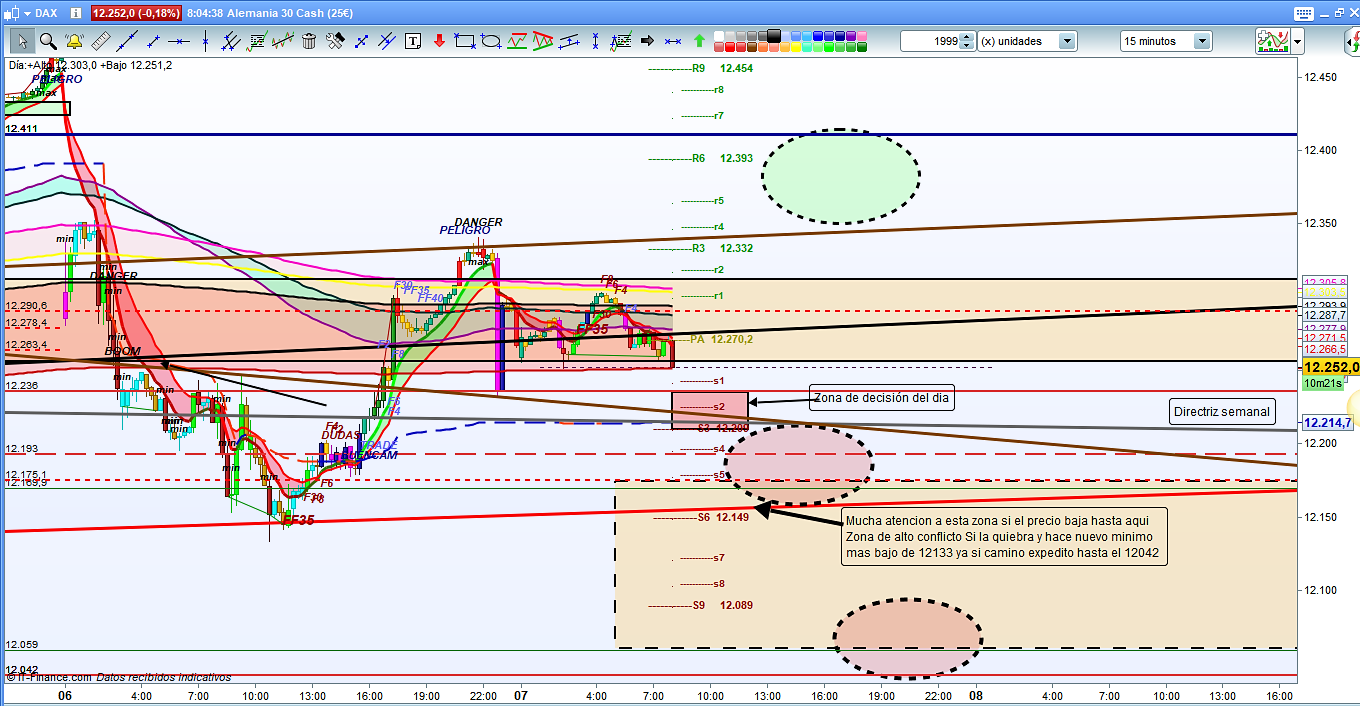 Ayer, en el gráfico de 15 minutos, decíamos que la zona de 12312 a 12315 era zona importante de resistencia, que si la rompía la cotización dax iría de nuevo hacia 12411. Después marcábamos la zona de decisión del día entre 12236 y 12210. Y después marcábamos los dos objetivos por la parte inferior, con detalladas explicaciones.