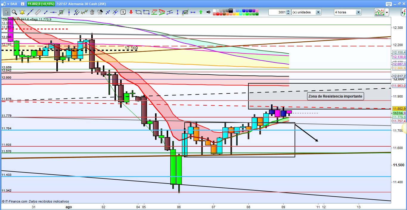 En el gráfico de 4 horas del dax30, algunos detalles muy importantes. Por un lado podemos ver como en el impulso de tendencia principal, la cotización dax iba con fuerza y seguridad, la bajada fue toda hasta las dos velas finales con incremento de fuerza del mercado. Desde que empezó la corrección la fuerza ha desaparecido y ahora, cuando ha llegado a la zona de fuerte resistencia, llevamos ya 4 velas, 16 horas, de indecisión total. En principio, el movimiento correctivo no ha finalizado, aunque técnicamente ya ha superado el 0,61,8% y esto nos tiene que poner sobre alerta. Sólo por debajo del 11740, y sobre todo con posible patrón de quiebre por debajo de 11704, entenderíamos que podríamos volver a estar en movimiento bajista. Mientras esto no ocurra seguimos en movimiento correctivo alcista, con objetivos de alta probabilidad, la zona del 11876, 11904.