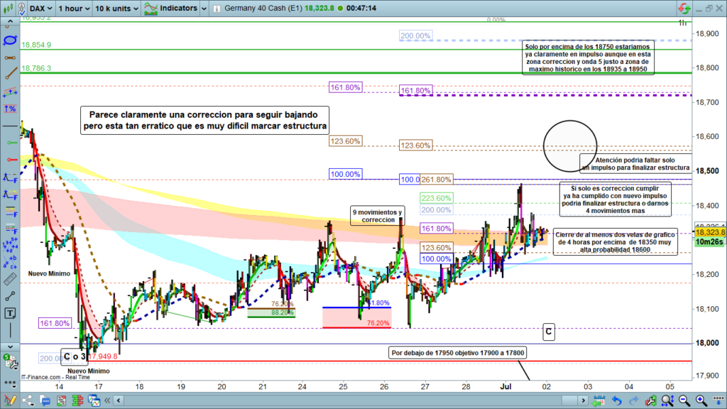 En gráfico de una hora del Dax 40, después de tantos y tantos días errático, parece que por fin podríamos tener estructura. Si la estructura es correctiva como parece, le faltaría como mínimo un nuevo impulso con objetivo muy difícil de proyectar. La teórica segunda parte de corrección, cumplir ya ha cumplido, nos ha dado un nuevo máximo por encima de los, 18367, y además esta teórica onda C, ha sobrepasado la zona del 61,8% de la onda A, sí tuviéramos un nuevo impulso sería para llegar hasta la zona entre el 100% y el 123,6%, para finalizar teórica corrección.