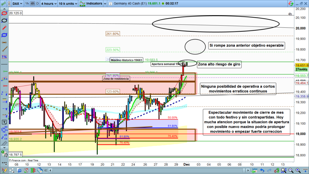 El DAX 40 alemán experimentó un movimiento alcista inesperado al romper una resistencia de más de dos meses, coincidiendo con el cierre de noviembre y un festivo en EE.UU., lo que facilitó movimientos especulativos. Sin embargo, al acercarse a máximos históricos, el mercado podría estar formando un patrón de giro, sugiriendo un posible movimiento correctivo bajista.