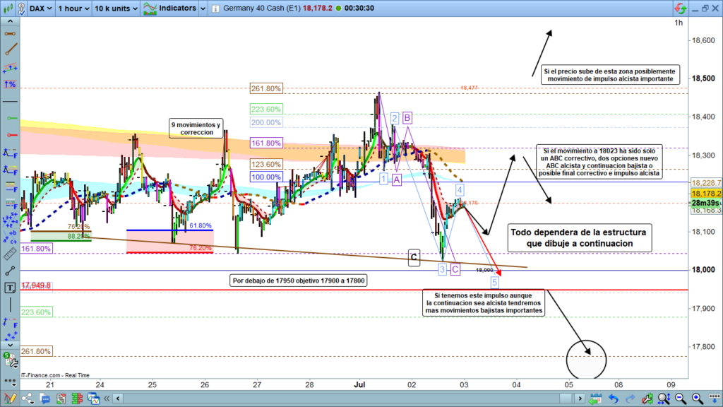 En el caso de que el precio bajara de nuevo hasta la zona de los 18000, o incluso un poco por debajo, habríamos completado una clara estructura impulsiva de cinco movimientos. Aunque el siguiente movimiento sería para volver a subir, posiblemente hasta la zona de los, 18300, lo haría solo en forma correctiva para tener nuevos movimientos bajistas más importantes. La zona objetivo más probable sería inicialmente la zona de los 17800.
