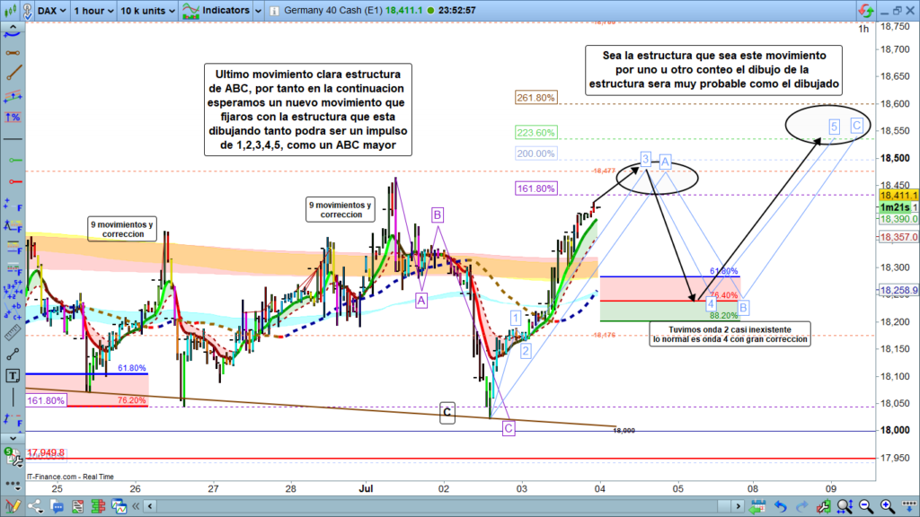 Si esta es la estructura que inicialmente dibuja, y tenemos un nuevo alto por encima del Alto anterior, lo lógico es que tuviéramos esta importante bajada en forma de corrección de onda 4, deberemos vigilar sí realmente la corrección finaliza en la zona esperada aproximadamente entre los,18250 y los 18300, y si en esta zona se produce un rebote el siguiente movimiento será bastante claro hasta la zona de los 18550 a 18600.