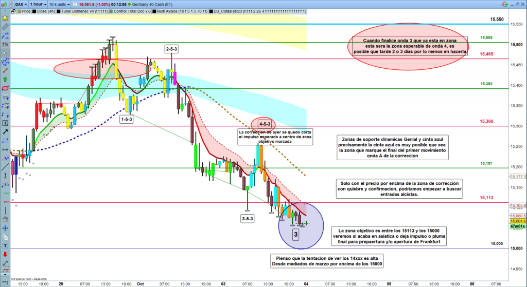 Análisis diario Dax, tipo flash corto, lectura de 2 a 4 minutos, con las claves del día. Ondas de Elliot, estructuras de precio, zonas clave y objetivos.