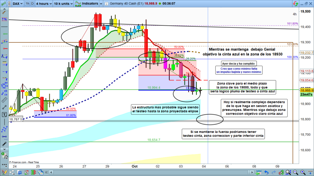 Ayer, de nuevo día muy complicado para operar, moviéndose el precio en la zona marcada y esperada con soporte en la zona de los, 19000. Ni siquiera, tuvimos la pluma para llegar a testear la parte superior de la cinta azul. Inicio del día en los 19073, para acabar cerrando el día en la zona de los, 18980, al final 100 puntos pero con una operativa completamente errática prácticamente imposible de sacar ninguna rentabilidad.