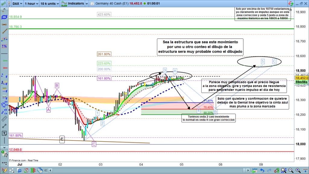 En gráfico de una hora del Dax 40, vemos como el escenario para el día de hoy es exactamente el mismo que ya planteábamos el día de ayer, sabiendo que el día de ayer al ser un festivo tan importante en USA afectaría sin ninguna duda a todos los mercados. Atención porque hoy todo y ser viernes, muy posiblemente en los mercados americanos, muchísimos inversores estarán haciendo puente, con lo que en el momento de las noticias de datos de empleo podríamos tener o no cierta volatilidad al no haber casi contrapartidas en el mercado.