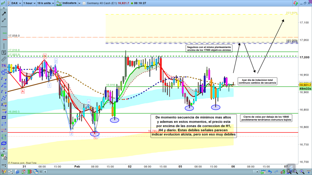 A nivel de posible evolución, estamos exactamente igual que el día de ayer. Solo por encima de la zona de los,17000, ya validaría la estructura alcista con un primer movimiento hasta la zona de los, 17040 a 17058. Nueva corrección el último impulso hasta la zona aproximada de los, 17120.
