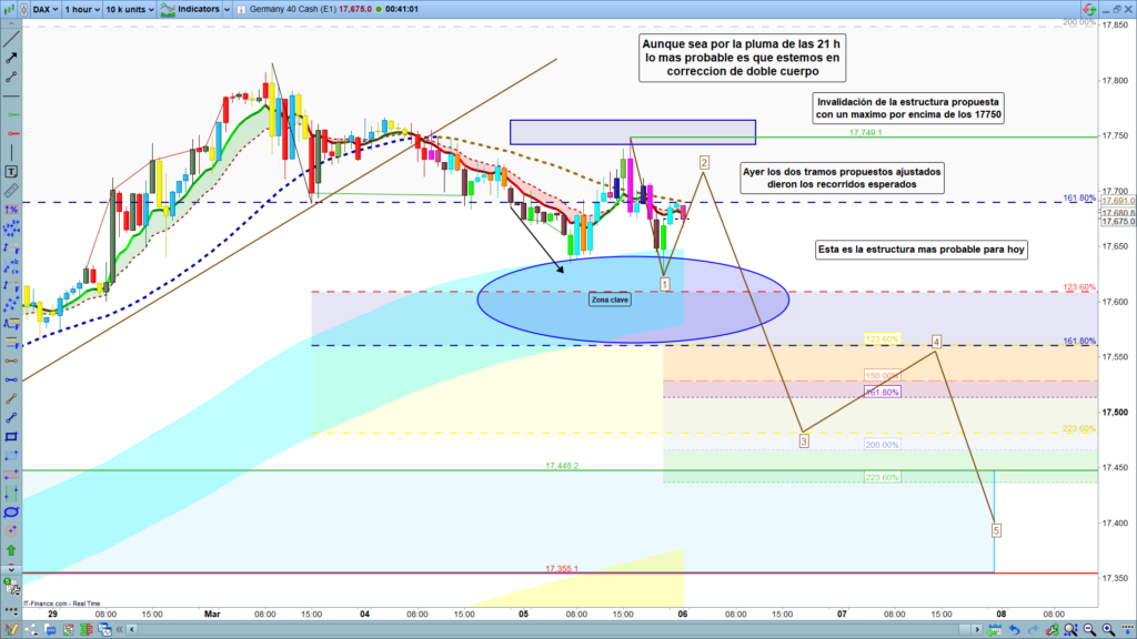 Precisamente, por si fuera al revés, la zona de los, 17750, alto del día de ayer, si tenemos un máximo, aunque sea por un par de puntos por encima de esta zona, automáticamente quedará invalidada la propuesta de estructura marcada en el gráfico y explicada en este flash y muy posiblemente estaríamos ya claramente en un nuevo impulso alcista. Muchísima suerte y muy buenos trades.
