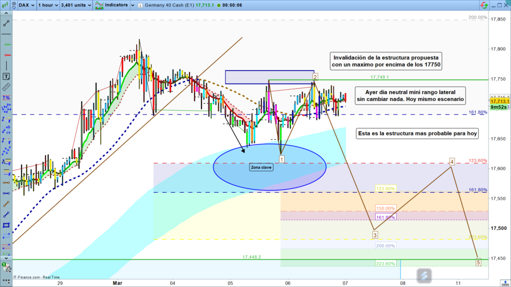 Solo, movimiento más alto de la zona de los 17750, invalidaría la estructura antes planteada y el movimiento más probable pasaría a ser el estar ya en un claro impulso alcista con objetivo la zona de los 18000.