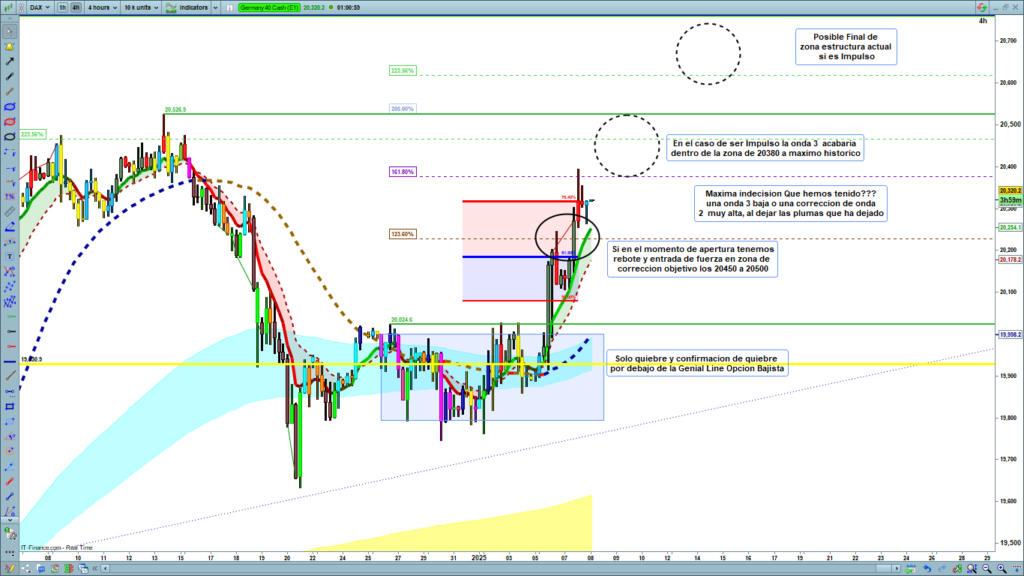 Análisis diario Dax, tipo flash corto, lectura de 2 a 4 minutos, con las claves del día. Ondas de Elliot, estructuras de precio, zonas clave y objetivos.