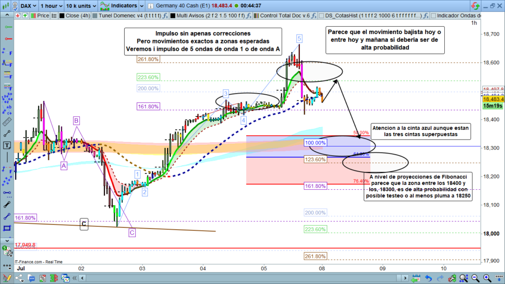 Si estuviéramos en una zona de onda B, la zona más probable de rebote sería aproximadamente entre la zona de los 18380 a 18400, en el caso de que estuviéramos delante de una corrección más importante o incluso de un posible movimiento impulsivo bajista la zona de alta probabilidad a alcanzar sería como mínimo la zona de los 18270 a 18250.