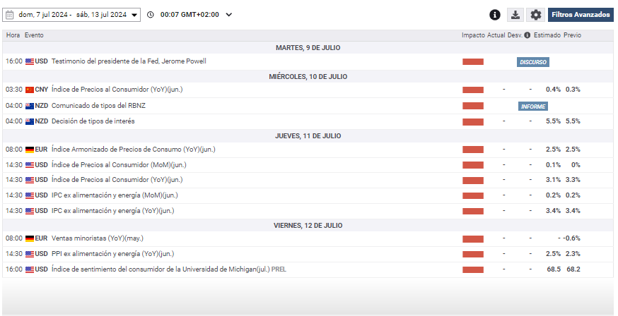 Publicado lunes 08 de julio de 2024, a las 00 h UTC. Las horas del Calendario Económico, son UTC+2.