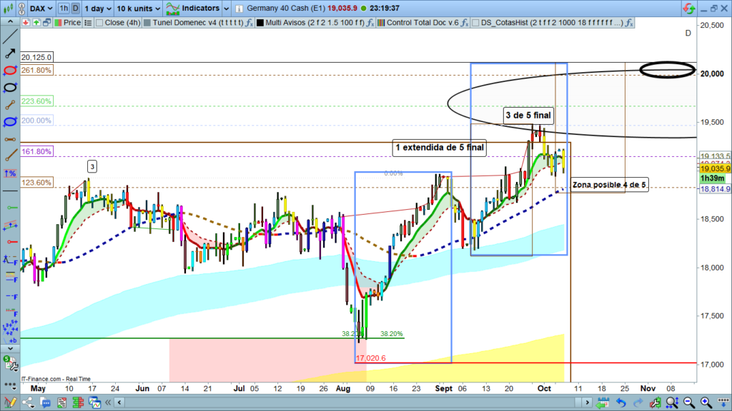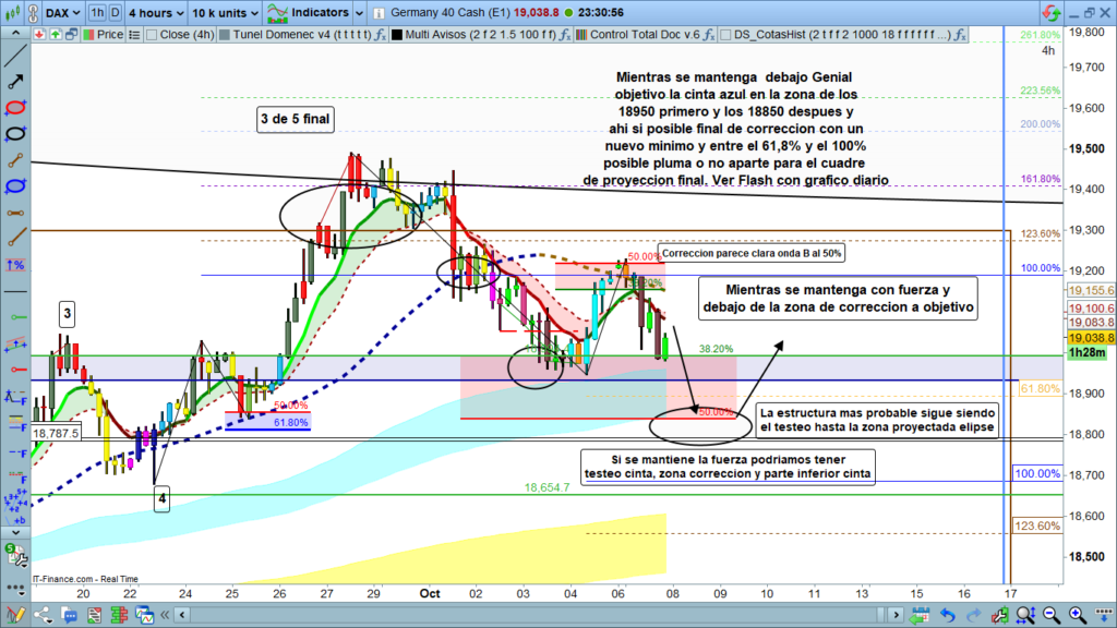 Análisis diario Dax, tipo flash corto, lectura de 2 a 4 minutos, con las claves del día. Ondas de Elliot, estructuras de precio, zonas clave y objetivos.