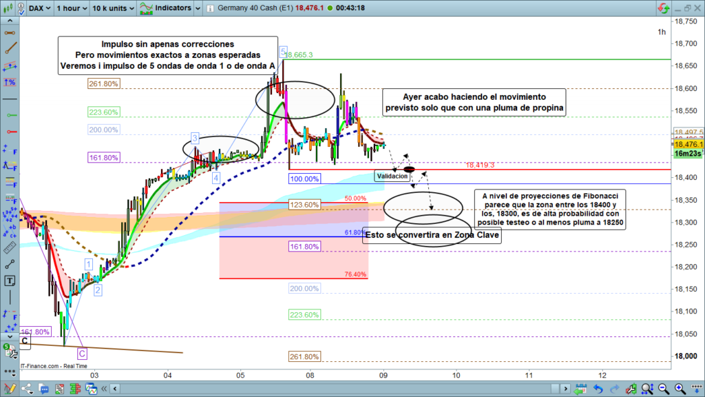 Si, en cambio, el precio al llegar a la zona comentada, prosiguiera impulso bajista importante, sobre todo si perdiéramos ya la zona de los, 18200 a 18150, independientemente de las correcciones, la zona objetivo más inmediata sería de nuevo la zona de los 18000.