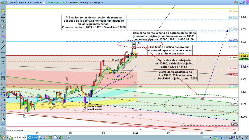 Por otro lado, si el precio solo rebota en zona de corrección de gráfico diario, y sale por arriba, lo más probable, aunque no operable hasta validación, sería un ataque hasta la zona de los 13601. Aquí sí que todo dependería de lo que haga el precio. Si no llega hasta los 13601, o rebota en la cota y vuelve a bajar, tendremos una validación temprana, con un mínimo por debajo de los 13475, alcanzado a las 01 h, aunque la validación clara y definitiva la tendremos con cierre de dos velas consecutivas y progresivas por debajo de la Genial line de diario, pase por donde pase a aquellas horas. objetivos bajistas los mismos que antes, 13200 y zona 13000.