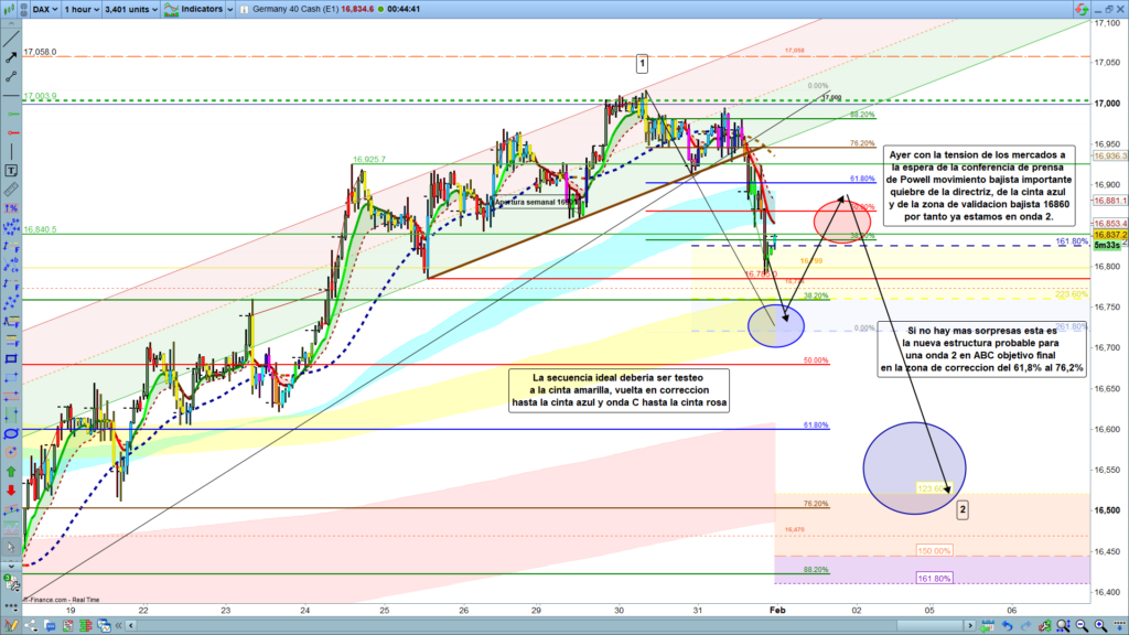 Para hoy, en sesión asiática y sesión Europea, posible finalización de esta primera onda A, muy probablemente en la cinta amarilla. Si fuera así, la posterior corrección volvería a subir hasta la cinta azul, un poco más arriba de la zona en la que se encuentra el precio en estos momentos de final e inicio de un nuevo día, en la zona de los, 16850, aproximadamente.