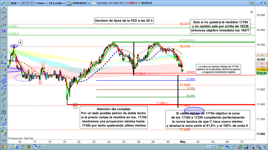 Técnicamente, el precio está relativamente cerca (de la neckline de un patrón de doble techo), en la zona de los, 17794, esta será la zona clave del día. Si el precio, rebota en la zona actual cinta rosa de H1 sin quiebre de la neckline, podríamos tener un movimiento de amplio recorrido por la parte superior, primero hasta la zona de los,18176, y con la validación por encima de los, 18238, movimiento impulsivo alcista con primer objetivo en los,18477.