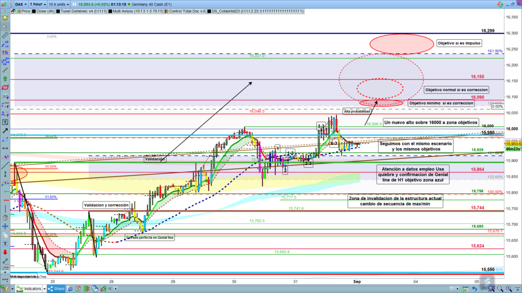 Hoy tenemos datos de empleo de Usa, y de momento los consensos son un poco peores que los datos anteriores, en el caso de que cuando estos se publiquen generen importante volatilidad. Mucha atención a la zona de los, 15796 a 15744, un mínimo debajo de esta zona, aunque sea solo con pluma de volatilidad, daría por finalizada la estructura actual y pasaríamos a nuevo impulso bajista. Muchísima suerte, muy buenos trades y pasad un muy buen fin de semana.