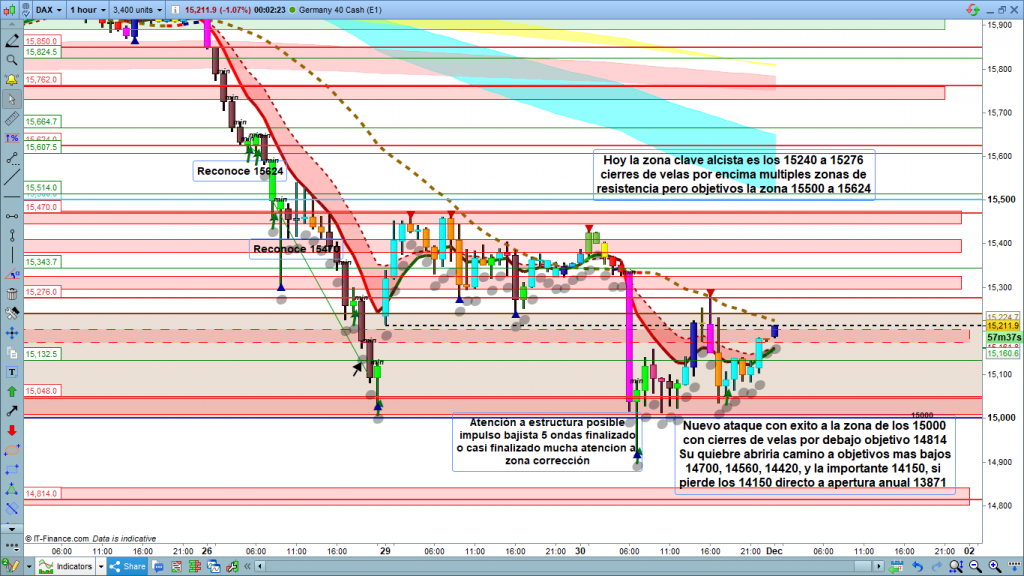 Ayer día fantástico, en el flash explicaba “Por la parte inferior, tenemos la zona de fuerte soporte de gráficos grandes 15240 a 15000, que ya paro el movimiento en su primer ataque. Un segundo ataque con ciertas garantías, debería ir acompañado de mucha fuerza. En el caso que se produzca esta situación. Pueden pasar dos cosas, tener un ataque con nuevo mínimo, pero sin quiebre debajo de los 15000 en gráfico diario, o sea solo pluma sin cierre del día debajo de los 15000. La pluma podría llegar hasta la zona 14980 a 14930. O tener un cierre con velas consecutivas y progresivas de gráfico de 4 horas por debajo de los 15000, con cierre por la parte inferior de la vela diaria, lo que posiblemente nos llevaría a atacar los 14814, y objetivos mucho más bajos.” Y precisamente al esperar el movimiento, hoy sí que quien madruga ha tenido suerte, la operativa fue mucho más fácil. La vela de las 6 h empezó en 15335, entrada a trade en 15239 y realizo mínimo más bajo. Paciencia dejando correr el trade hasta Take profit en 14950. Después a partir de las 8 h. los que tengáis instalado el indicador Cotas diarias, en algún gráfico para intradia, por ejemplo 12 o 15 minutos, habréis visto que desde las 8 h momento de apertura del PA, primero subida hasta R9. y a las 18 h vuelta a PA y como si no hubiera pasado nada. La evolución del día desde pre apertura, ha sido desde las 8 h, 220 puntos de subida hasta las 16,30 h. y hasta las 18 h de nuevo 220 puntos de bajada. Con tantos recorridos, no fue difícil sacar rentabilidad en el mercado solo buscando los tramos más seguros de cotas a cotas. Además, la zona que anteayer actuó como soporte, la que olvide en los 15240, ayer actuó como resistencia, quedando el precio atrapado en la zona de fuerte soporte de gráficos grandes 15240 a 15000. Esto facilitará la operativa de hoy.