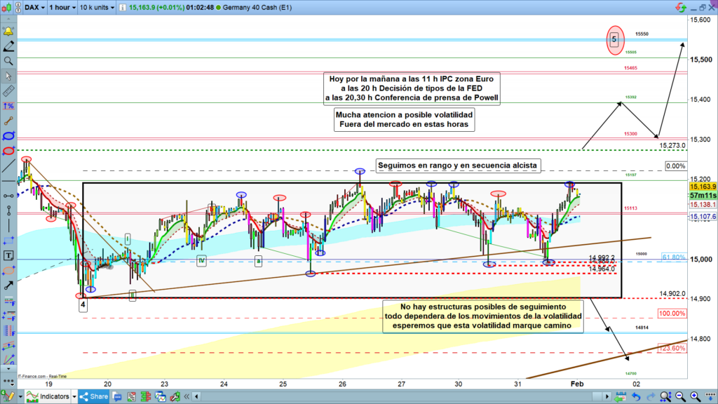 Las zonas importantes a vigilar son por arriba un nuevo máximo por encima del último alto, en los 15272, y por debajo la zona del 14902, un alto o un bajo en estas cotas, debería llevar el precio a las zonas objetivo marcadas. Mucha atención, que con volatilidad muy importante en varias plumas seguidas puede activar estructura y finalizarla, tenedlo en cuenta. Eso mucha precaución de 10,45 h, a 11,15 h, lo mejor es estar fuera del mercado, y por la tarde a partir de las 19,45 h, ya prácticamente hasta las 21,15 h, y mejor hasta las 22 h ya fuera de los mercados. Muchísima suerte y muy buenos trades, pero es día ya de precaución.