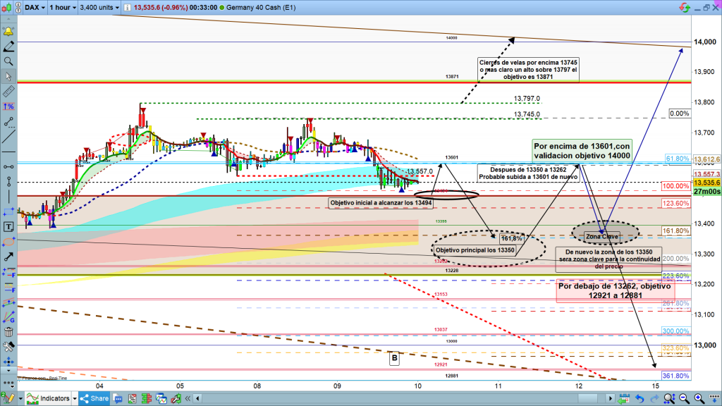 De entrada esperamos la cota 13494, después veremos la corrección que nos toca, lo más probable vuelta hasta los 13601, antes de seguir bajando hacia la zona de los 13350, si hay fuerza en aquel momento cuidado con posible movimiento rápido o pluma hasta los 13262. Desde esta zona los 13350, a 13262, nueva corrección, aunque he dibujado de nuevo los 13601, quizás no llegue ni mucho menos hasta esta zona, y nueva bajada hasta los 13262. Ahora si, corrección importante o impulso alcista, hasta los 13601, de nuevo. En la posterior bajada hasta los 13350, ahí si zona clave. muy importante, para la continuidad de la estructura de corto plazo.