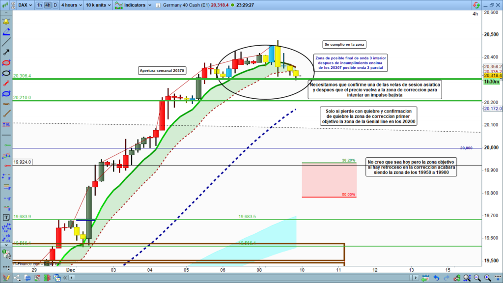 Análisis diario Dax, tipo flash corto, lectura de 2 a 4 minutos, con las claves del día. Ondas de Elliot, estructuras de precio, zonas clave y objetivos.